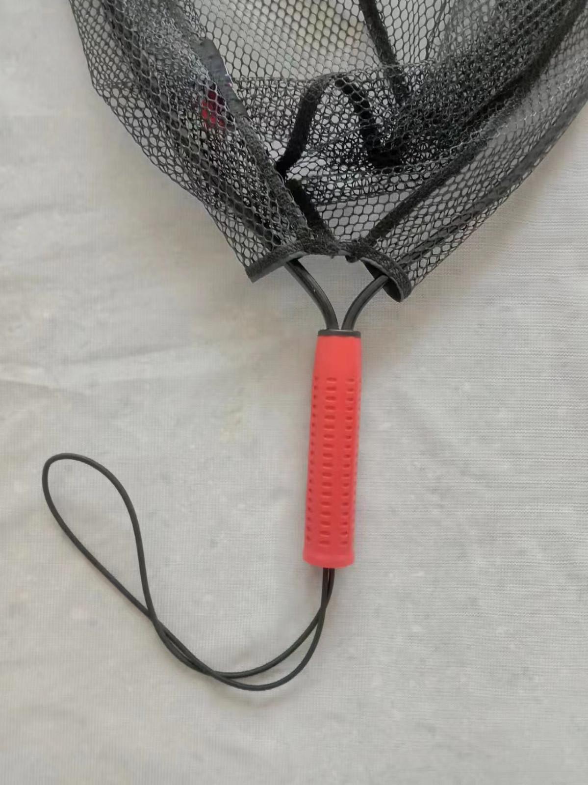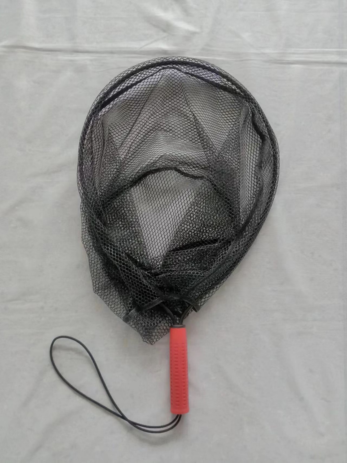 一體式抄網,鋁制網圈+塑料把手+黑色彈力繩,簡易使用,方便攜帶,掛膠網